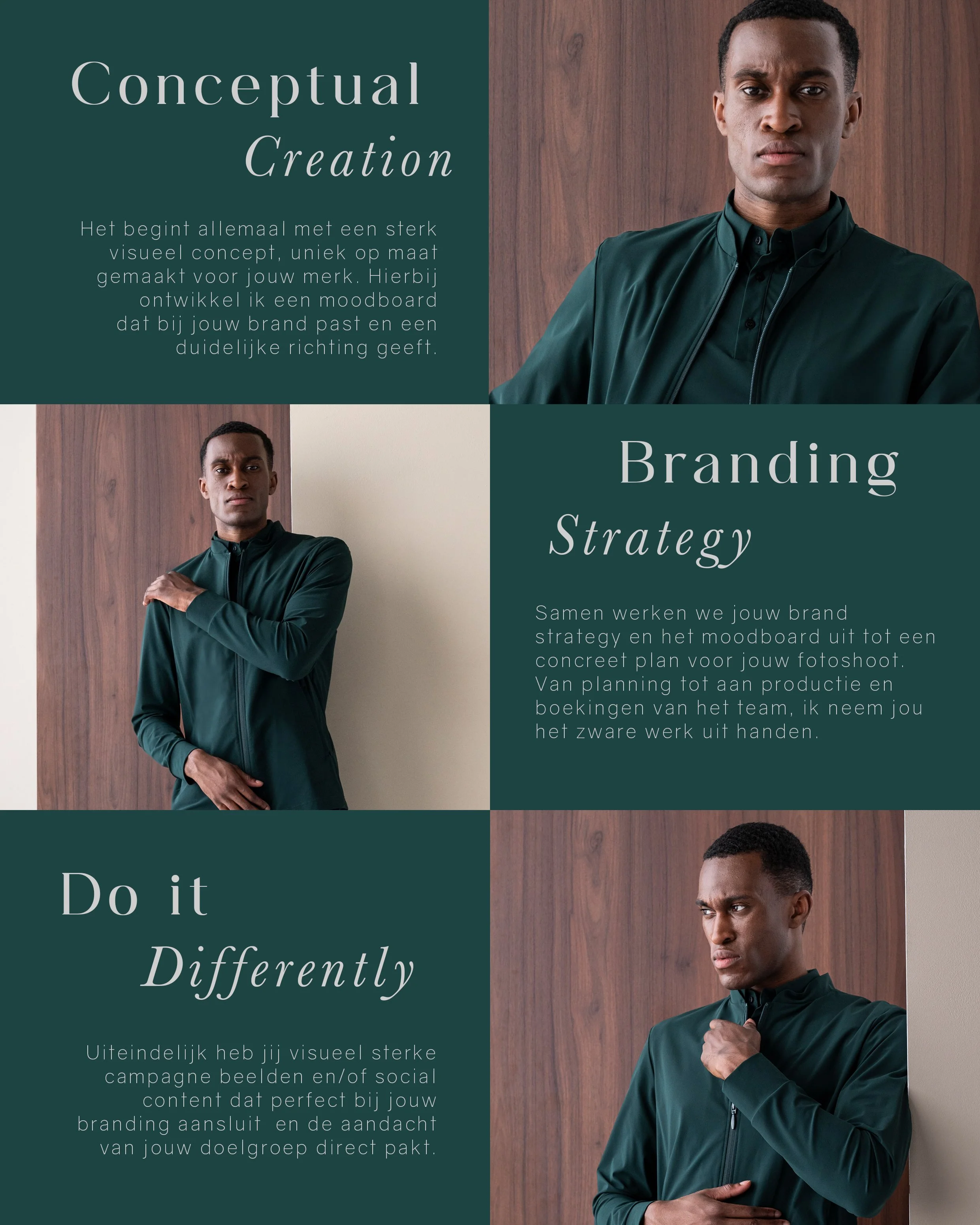 Echte sterke personal branding begint met pakkende beelden die bij jou als persoon passen. Vanuit mijn achtergrond in de fashion fotografie breng ik een uniek en visueel sterk concept, wat vervolgens wordt uitgewerkt tot een volledig gepersonaliseerde fotoshoot. Ik benader elke shoot als een fashion shoot: met aandacht voor het concept, de styling, locatie, licht en uitstraling. En jij bent het model, de ster van de show. Krachtige beelden waarin je jezelf eindelijk herkent en die de professionaliteit uitstralen die jouw business verdient. Perfect voor je website, social media en branding.